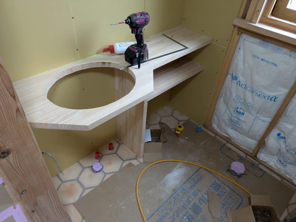ここはトイレなのですが、切り抜いた集成木カウンターに洗面ボウルを設置していきます。