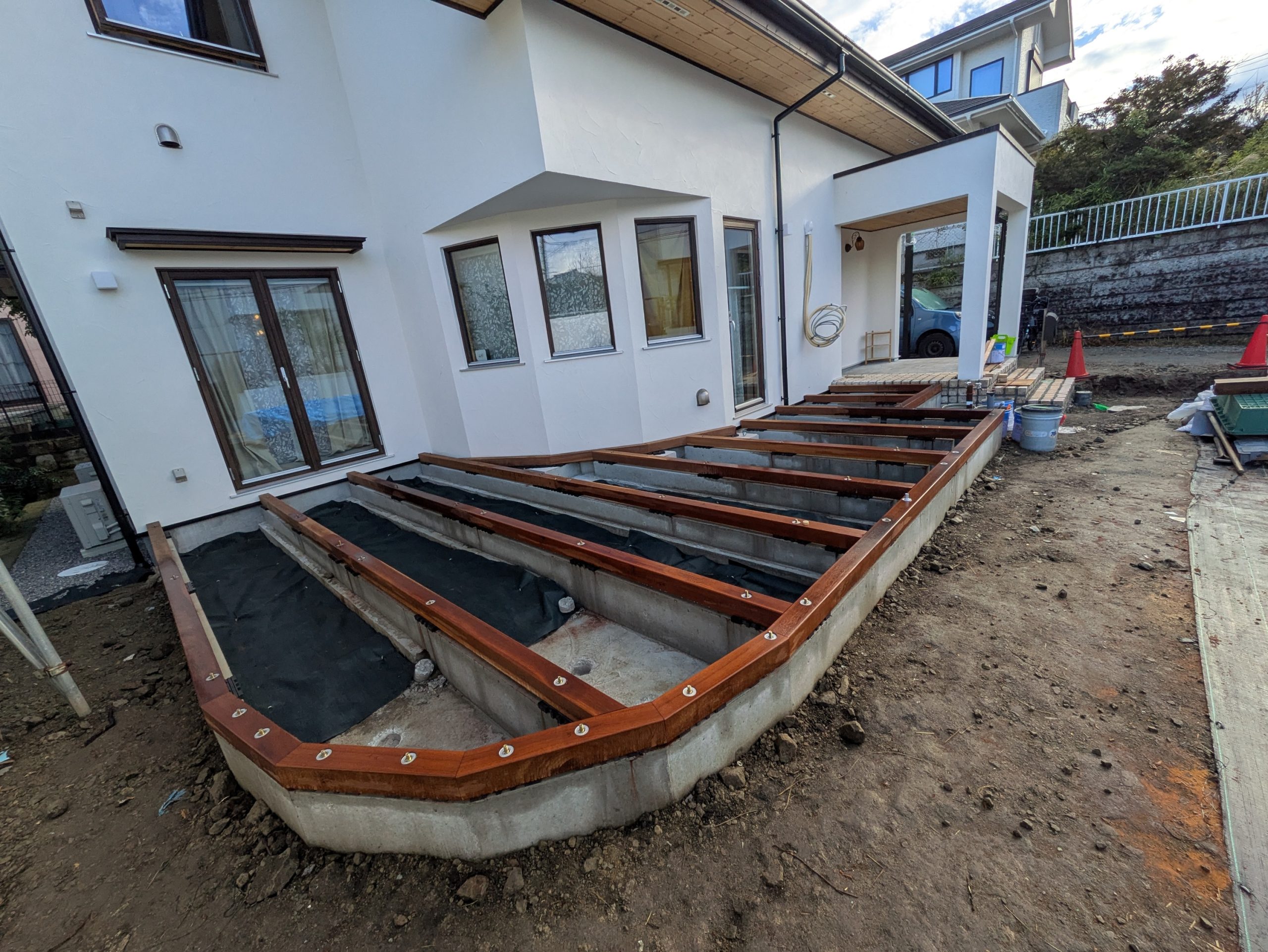 デッキもピンコロの写真に写っていますが、土台を敷き終わったところです。