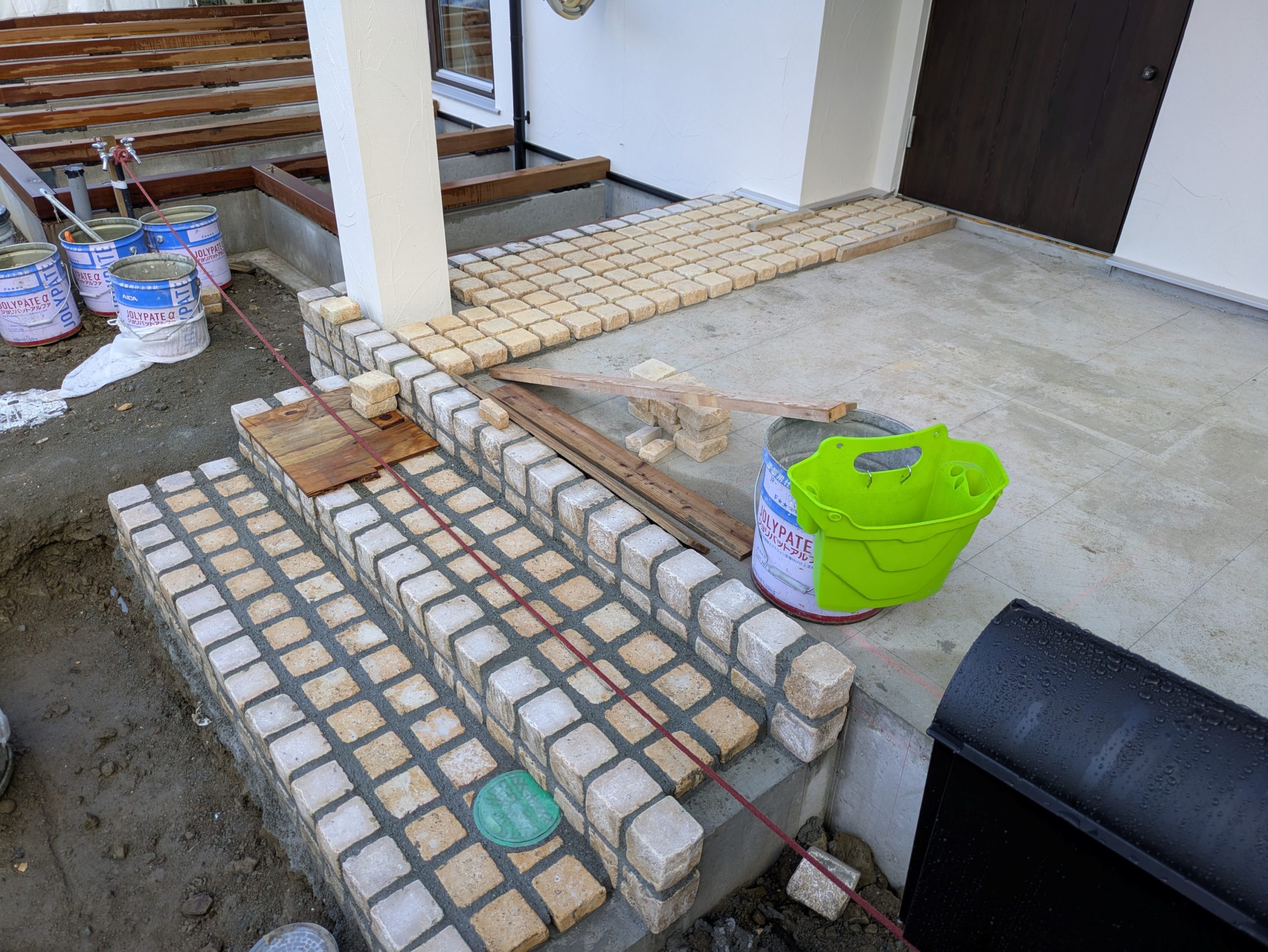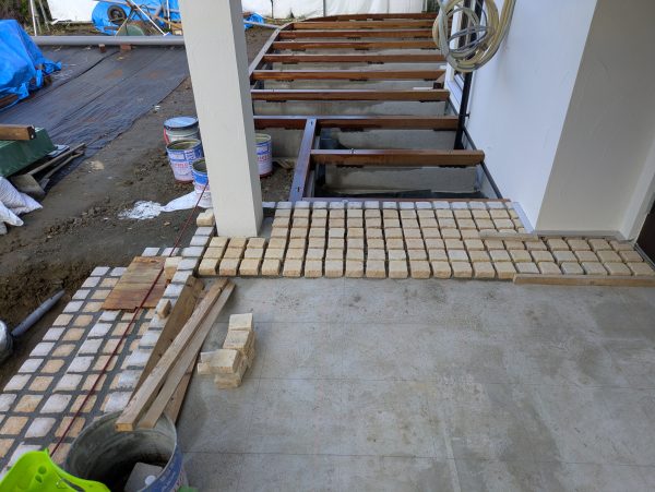 玄関ポーチにはピンコロを張り始めています。