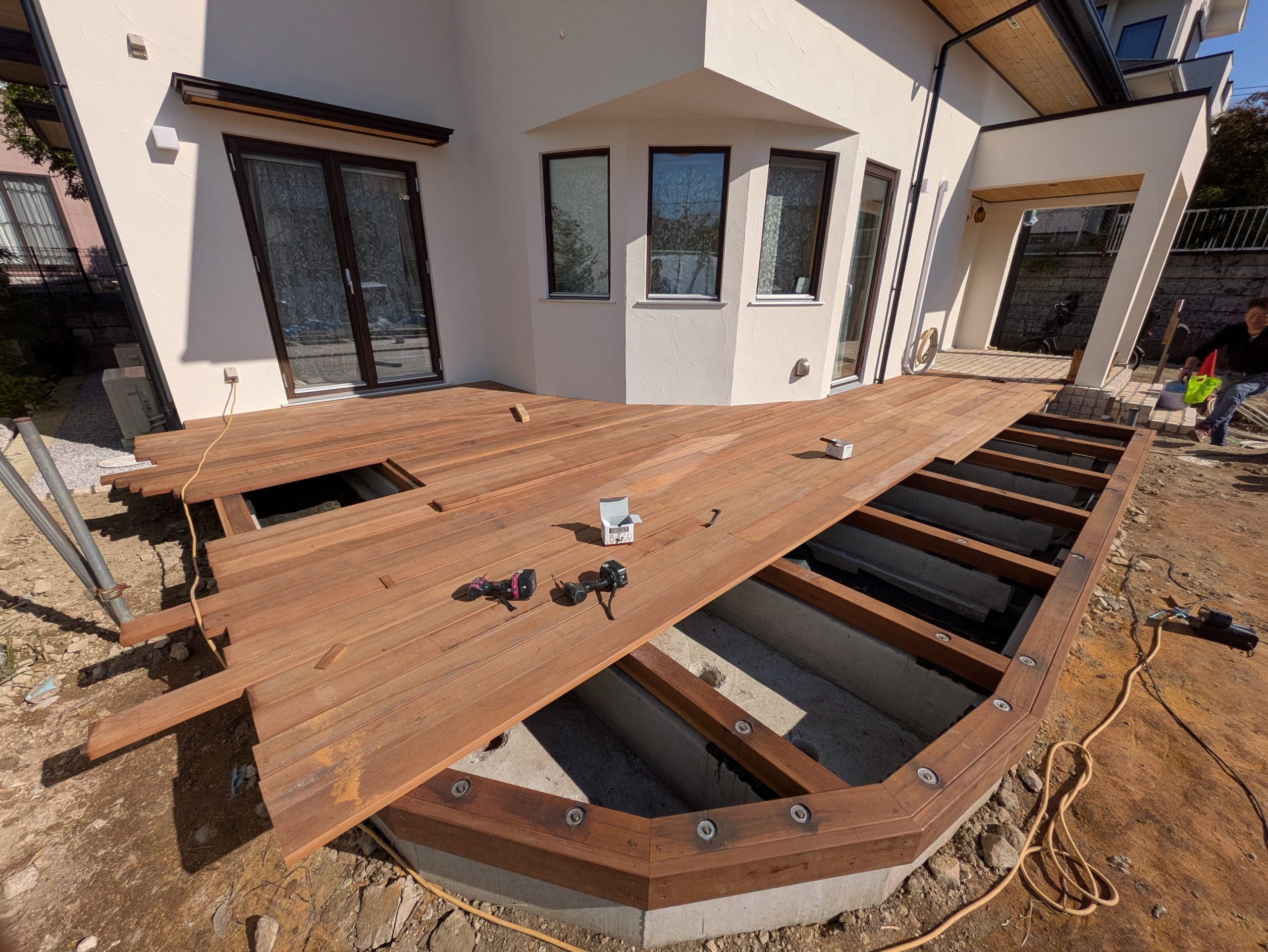 ウリンで制作しているデッキですが、半分以上板を貼ることができました。