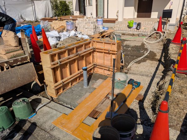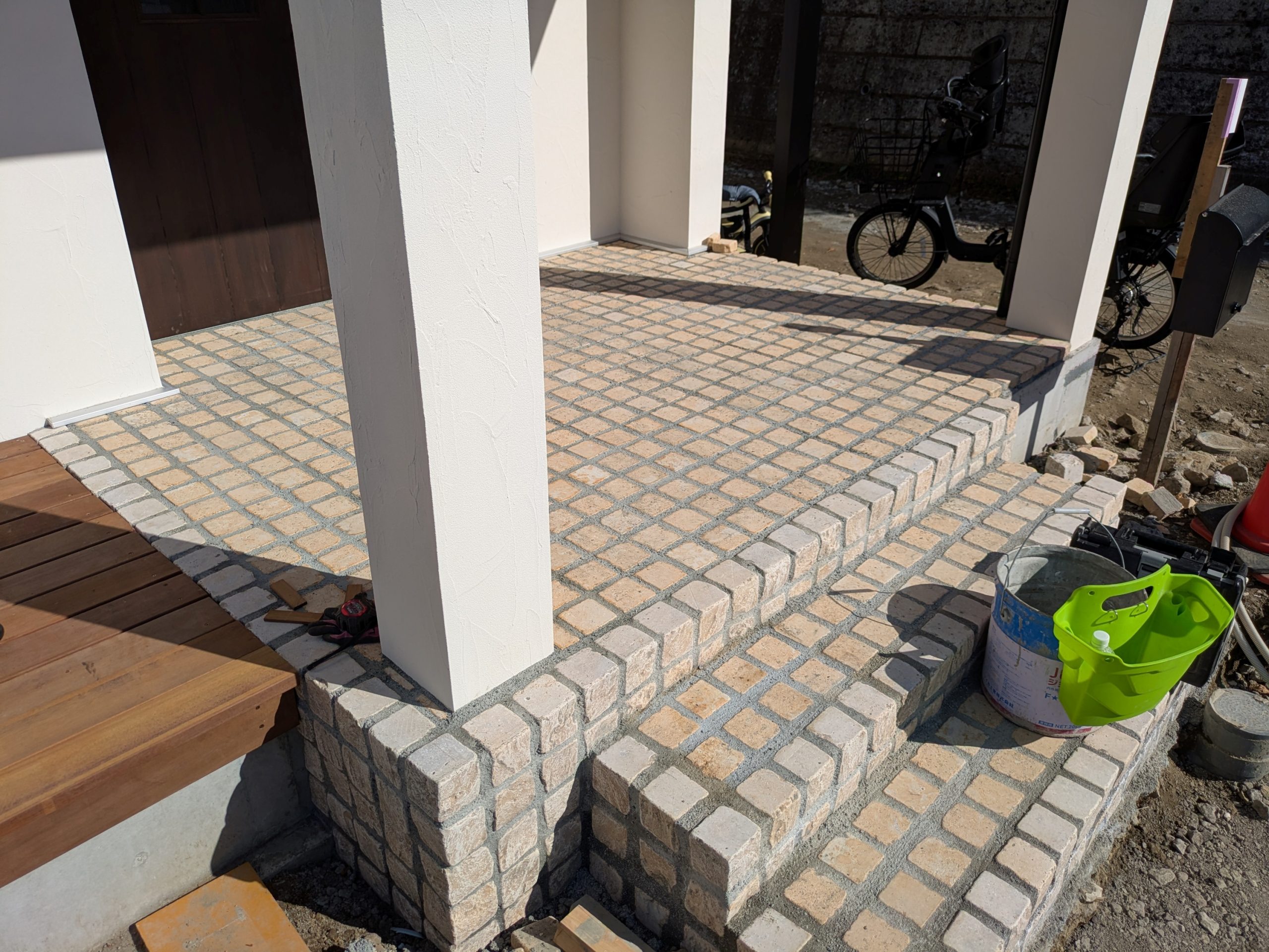 玄関ポーチもピンコロ敷きがほぼ完了です。