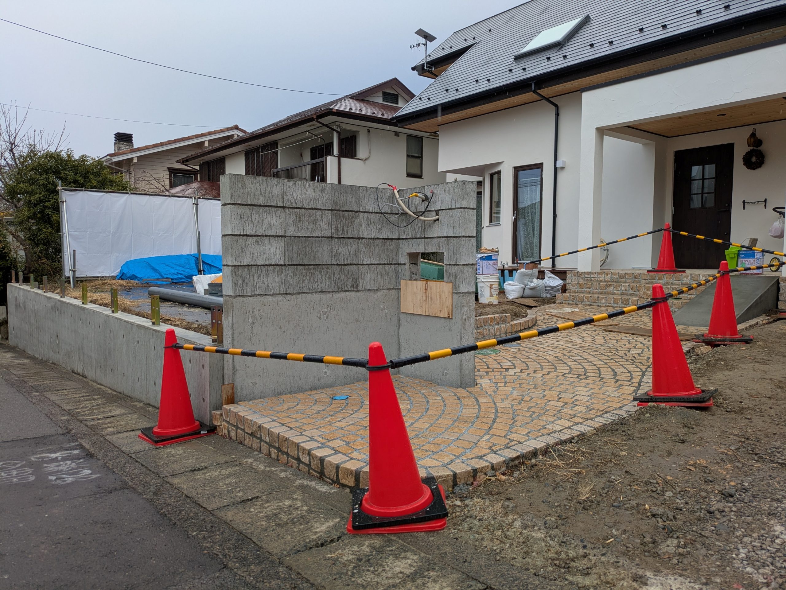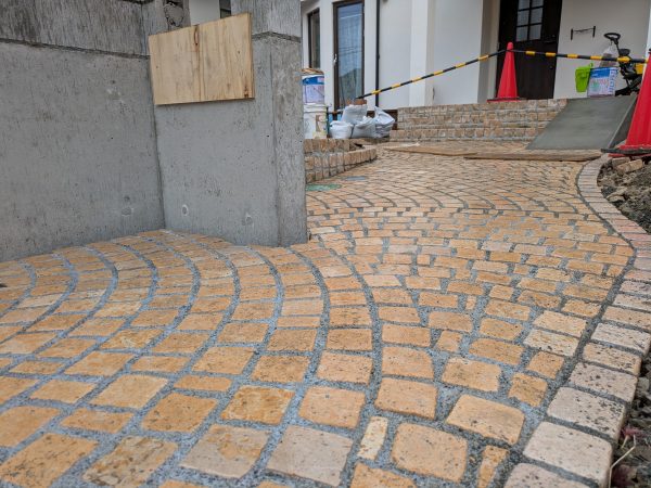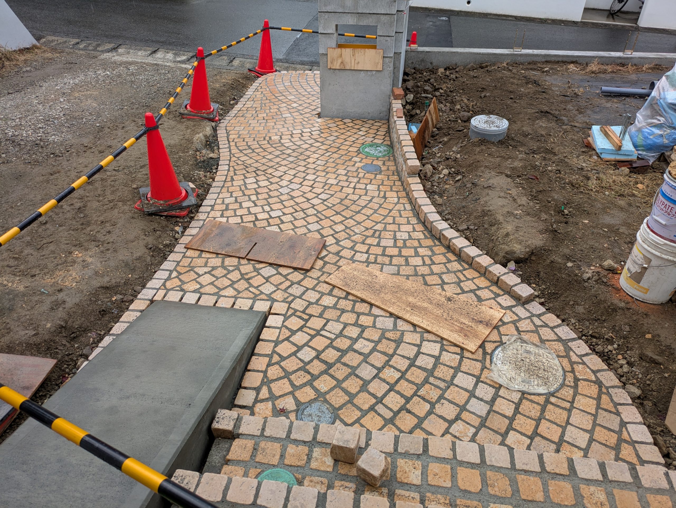 ピンコロの大きさが1個1個異なるので目地を通そうとすると、曲線なこともあり目地幅がかなり広がってしまいあまり格好よくない感じに仕上がってしまうなと。